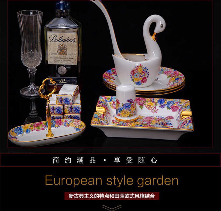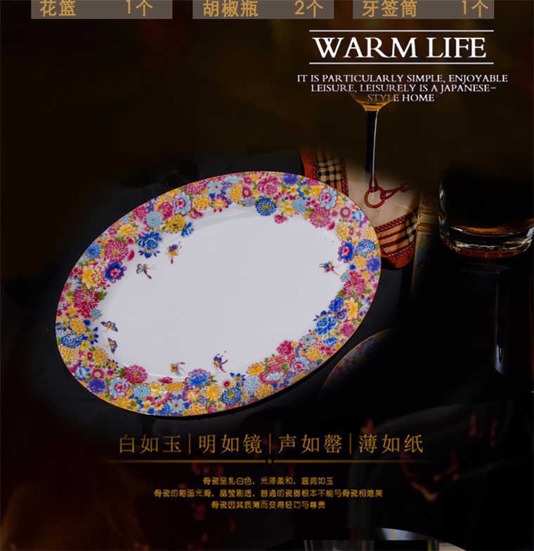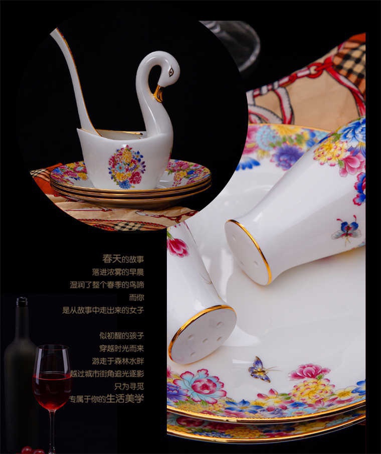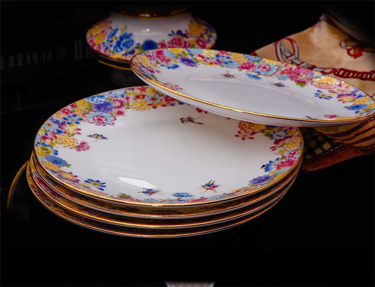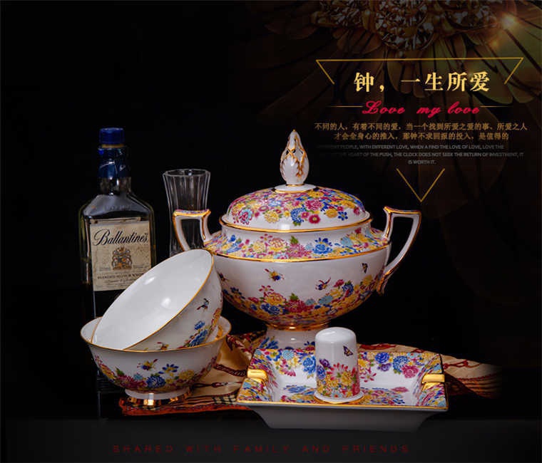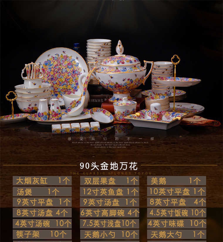 90頭金地萬花餐具,一個(gè)宮廷湯煲,一個(gè)十二寸魚盤,一個(gè)10寸平盤,一個(gè)10寸月光盤,一個(gè)9寸平盤,一個(gè)9寸湯盤,四個(gè)8寸平盤,四個(gè)8寸湯盤,四個(gè)6寸高腳面碗,十個(gè)4.5寸飯碗,十個(gè)4寸湯碗,十個(gè)7.5寸淺盤,十個(gè)4寸小蝶,十個(gè)筷架,十個(gè)天鵝小勺,一個(gè)天鵝大勺,一個(gè)花籃,兩個(gè)胡椒瓶,一個(gè)牙簽筒,一個(gè)大煙灰缸,一個(gè)雙層水果盤,一個(gè)美鵝,一個(gè)毛巾碟,兩個(gè)燉盅。