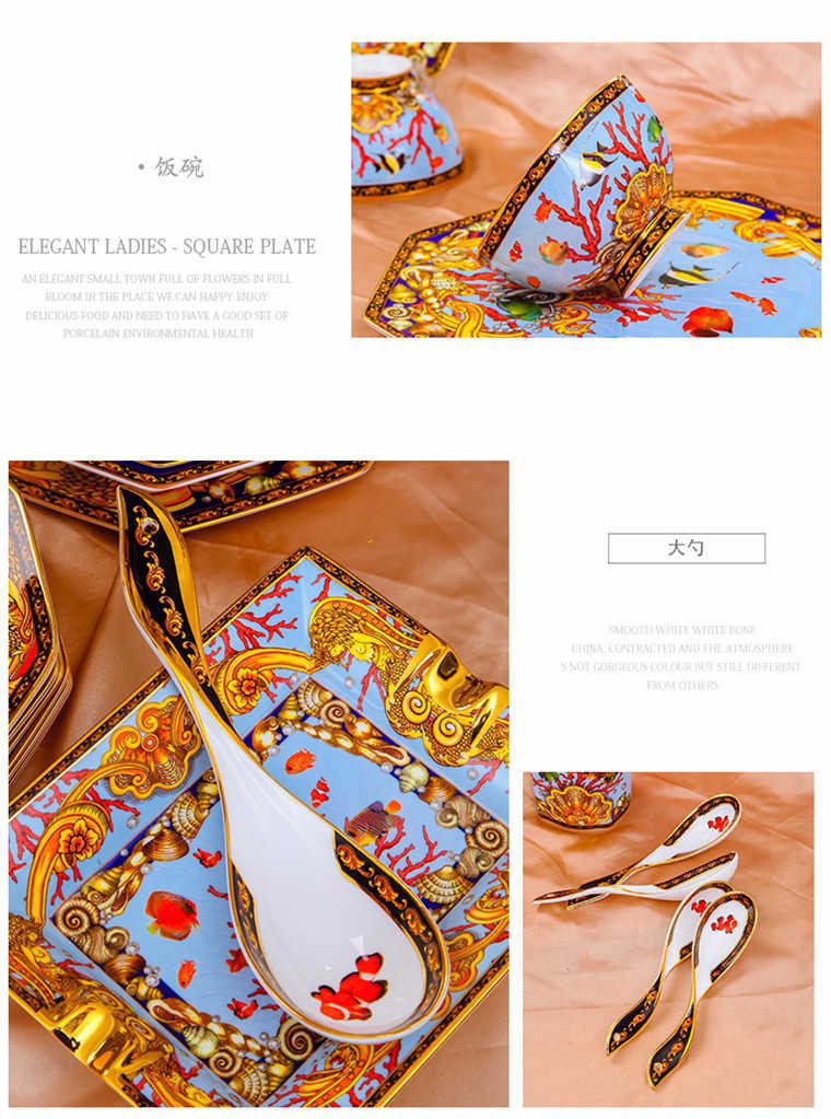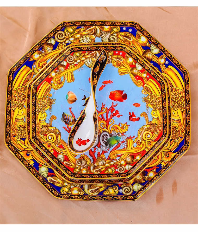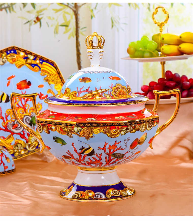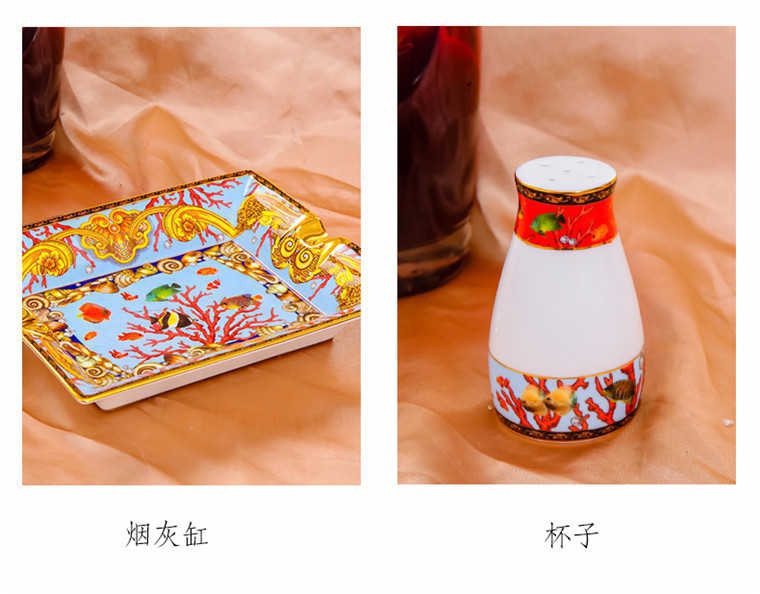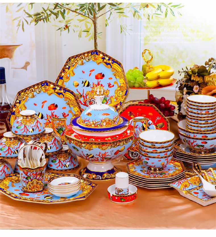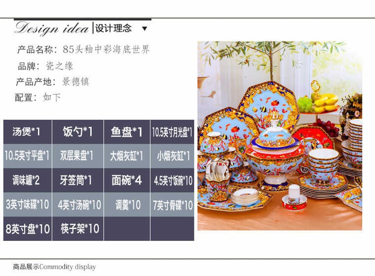 85頭釉中彩海底世界,一個湯煲,一個飯勺,一個魚盤,一個10.5寸平盤,一個10.5寸月光盤,雙層果盤一個,一個大煙缸,一個小煙缸,二個調料罐,一個牙簽筒,四個面碗,十個4.5寸飯碗,十個三寸調味碟,十個4寸湯碗,十個調羹,十個7寸骨碟,十個八寸盤,十個筷子架。