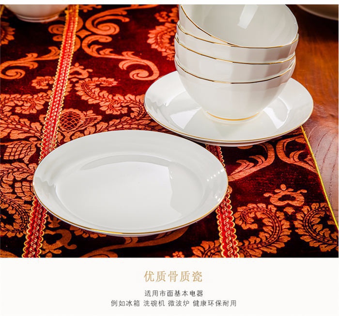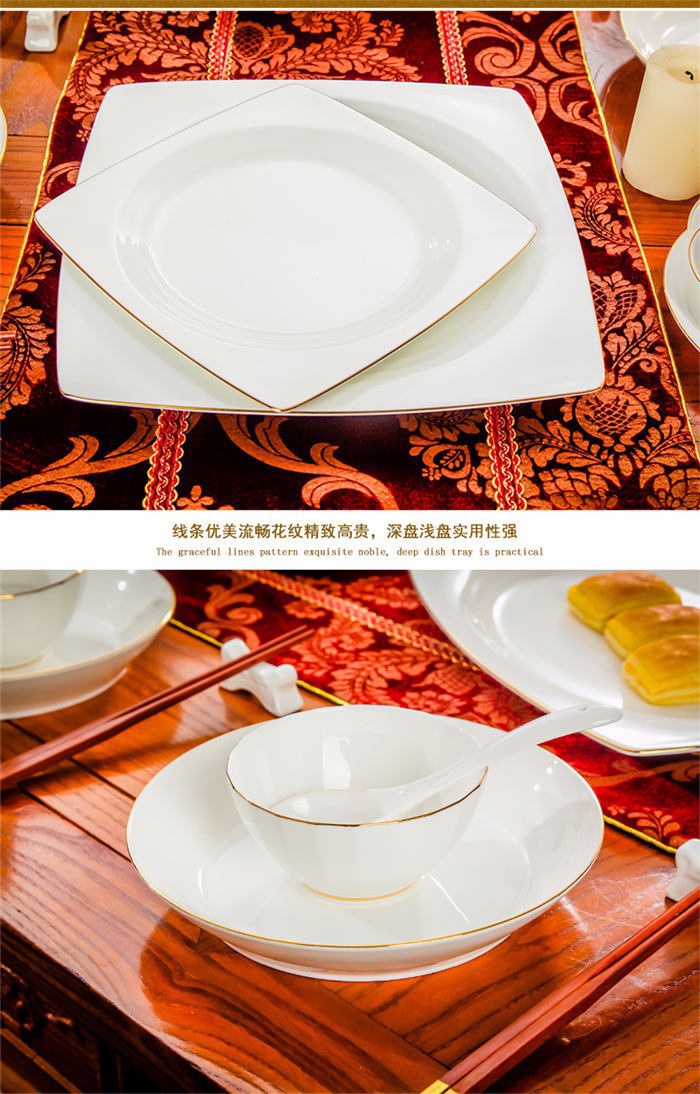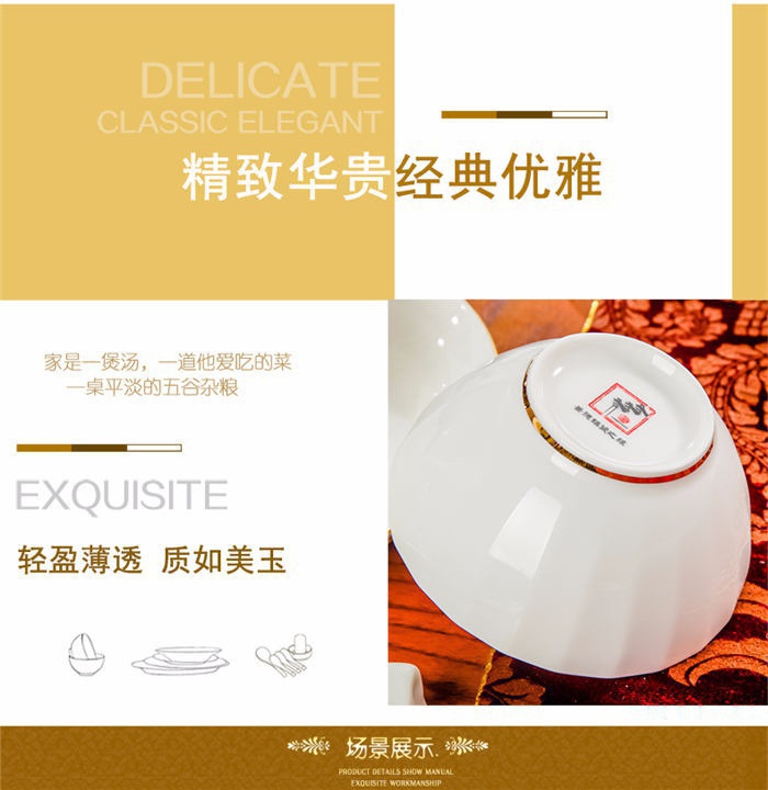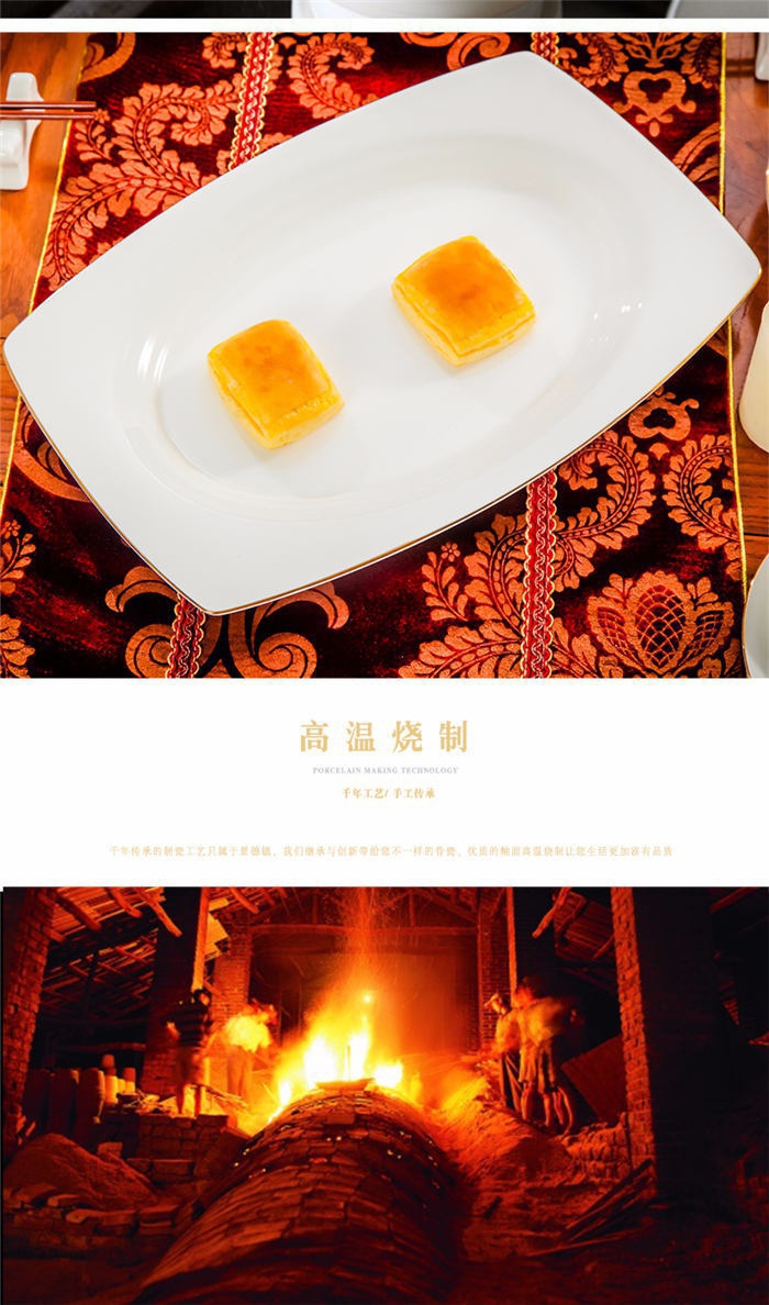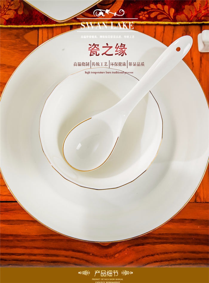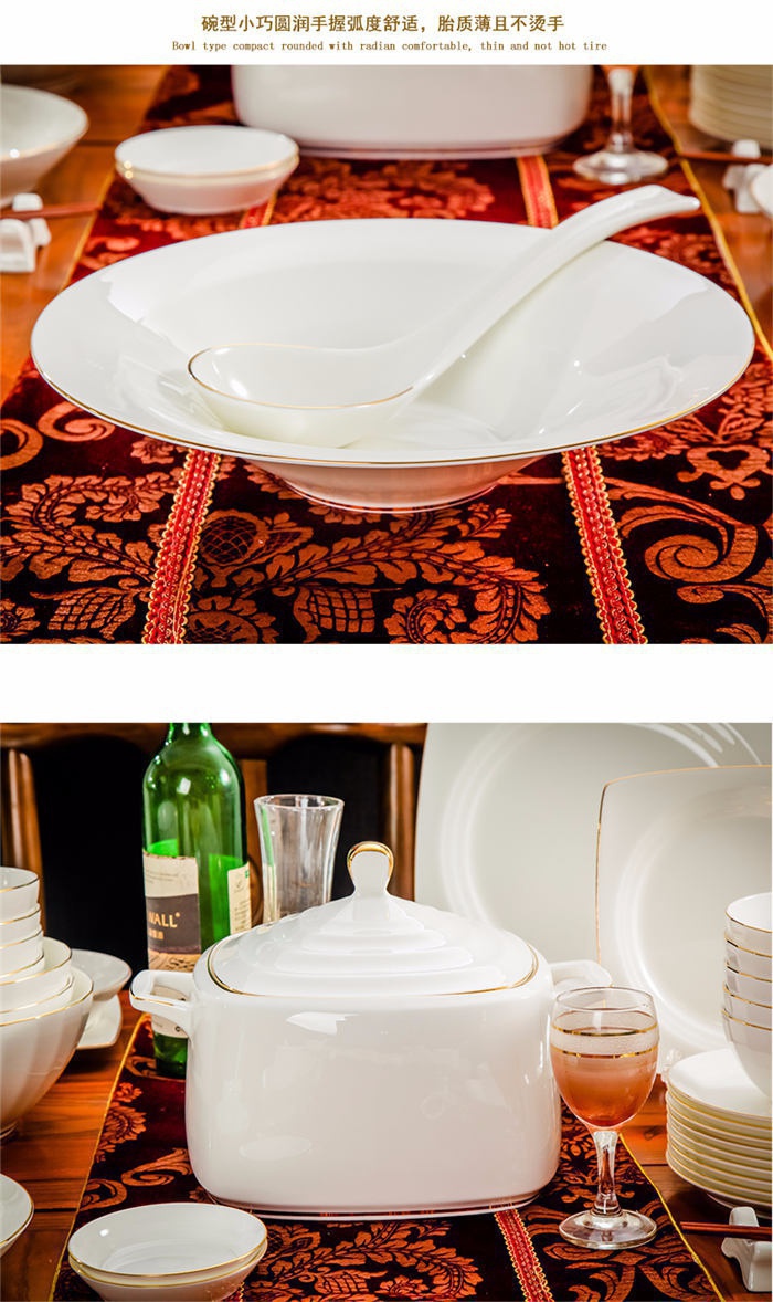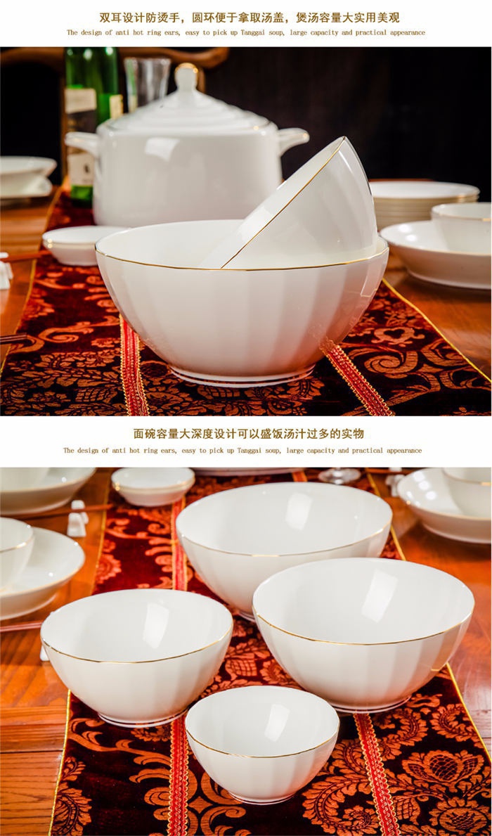 66頭純白描金,一個(gè)湯煲,一個(gè)魚盤,一個(gè)十寸圓盤,一個(gè)飯勺,一個(gè)煙灰缸,一個(gè)牙簽筒,七個(gè)面碗,十個(gè)4.5寸飯碗,十個(gè)八寸深盤,