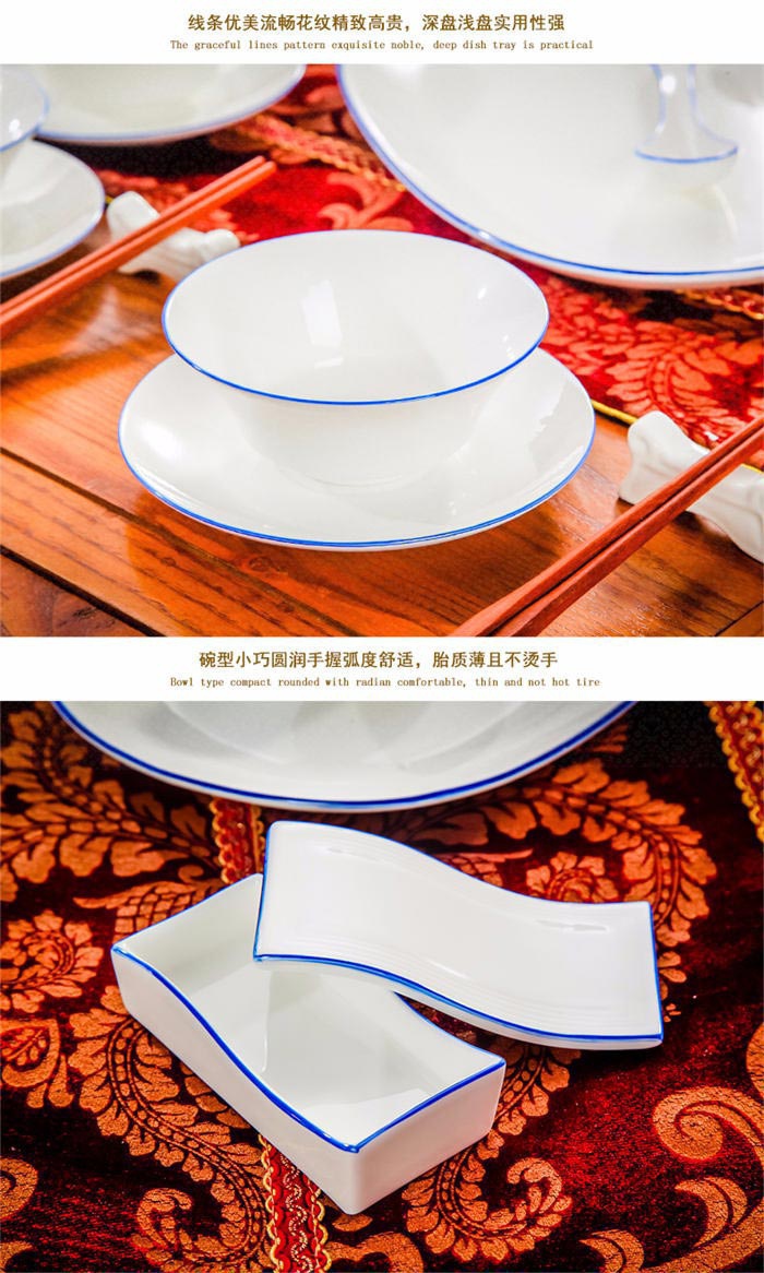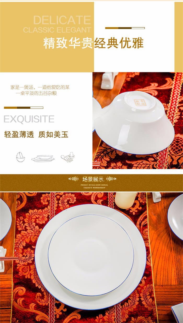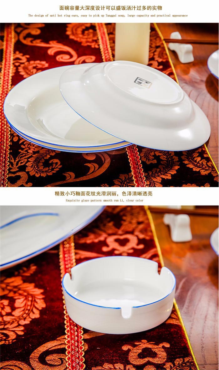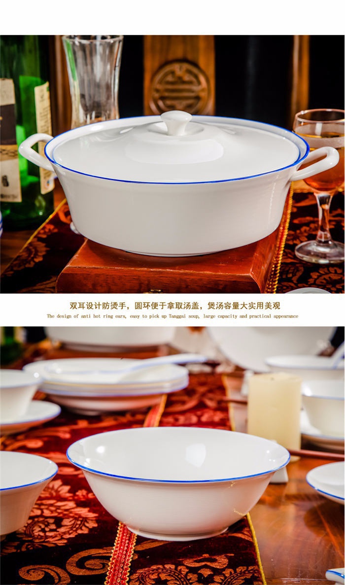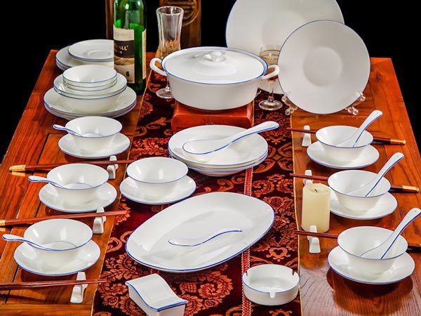 58頭蘭邊螺旋,一個湯煲,一個魚盤,一個十寸圓盤,一個飯勺,一個煙灰缸,一個牙簽筒,兩個面碗,十個4.5寸飯碗,十個五寸骨碟,十個八寸盤,十個調(diào)羹,十個筷子架。