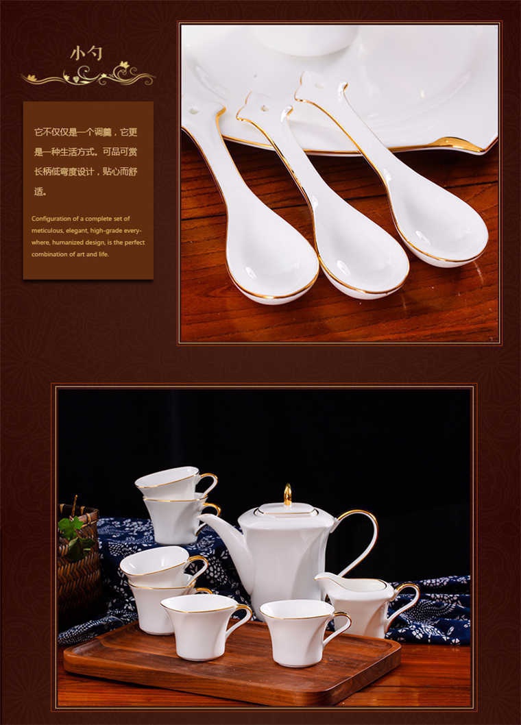 73頭旋方帶咖啡具,餐具一個(gè)湯煲,一個(gè)魚盤,一個(gè)十寸平盤,一個(gè)大湯勺,一個(gè)煙缸,一個(gè)牙簽筒,兩個(gè)面碗,十個(gè)八寸盤,十個(gè)4.5寸飯碗,十個(gè)味碟,十個(gè)調(diào)羹,十個(gè)筷子架??Х染咭粋€(gè)咖啡壺,一個(gè)糖缸,一個(gè)奶罐,六個(gè)杯子,六個(gè)碟子。