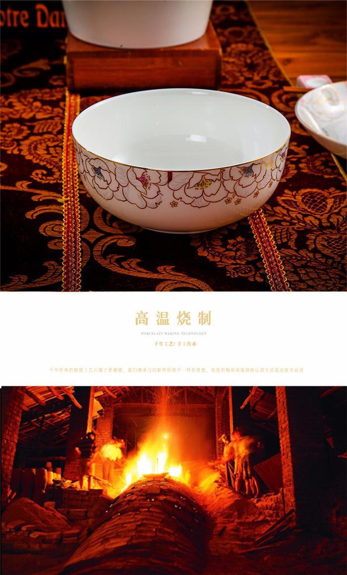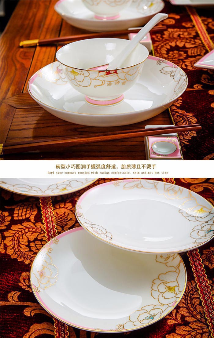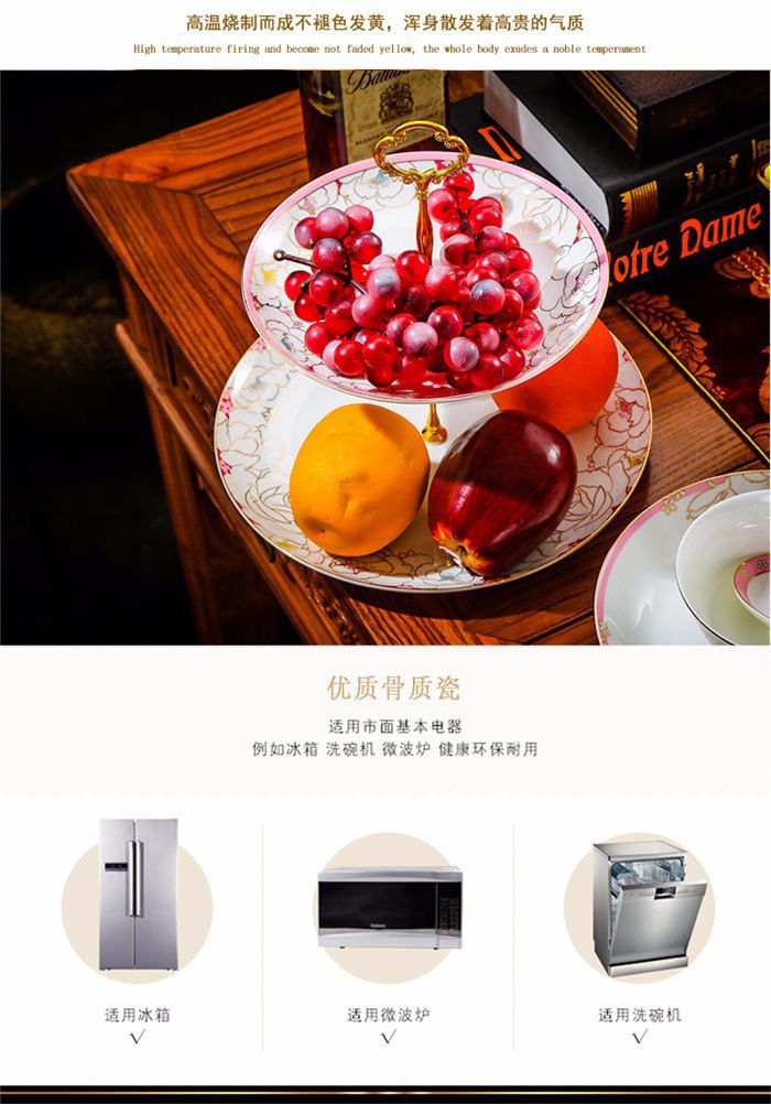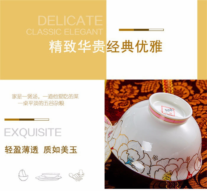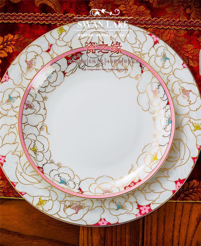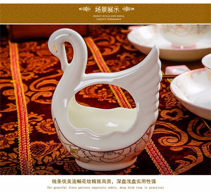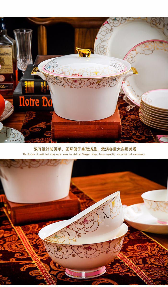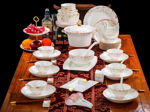 64頭凡爾賽玫瑰,一個湯煲,一個魚盤,一個十寸圓盤,一個飯勺,一個煙灰缸,兩個胡椒瓶,四個面碗,一個雙層水果盤,一個美鵝,十個4.5寸飯碗,十個五寸骨碟,十個八寸盤,十個調(diào)羹,十個筷子架。