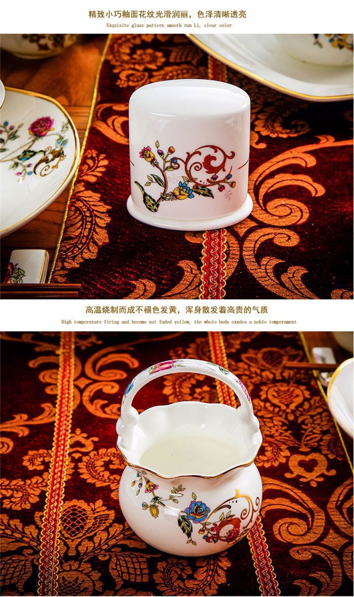 63頭景色滿園 一個湯煲,一個魚盤,一個十寸圓盤,一個飯勺,一個煙灰缸,兩個胡椒瓶,四個面碗,一個雙層水果盤,一個美鵝,十個4.5寸飯碗,十個五寸骨碟,十個八寸盤,十個調(diào)羹,十個筷子架。