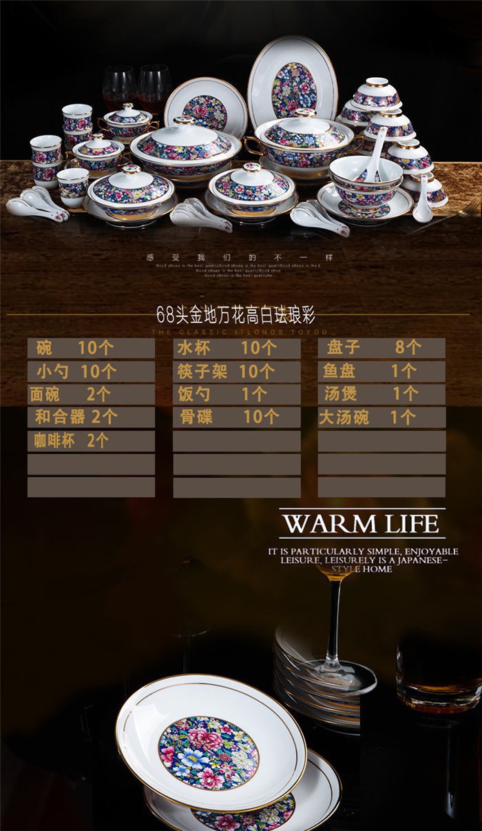 碗十個,水杯十個,盤子八個,小勺十個,筷子架十個,魚盤一個,面碗二個,飯勺一個,湯煲一個,和合器二個,骨碟十個,大湯碗一個,咖啡杯二個。
