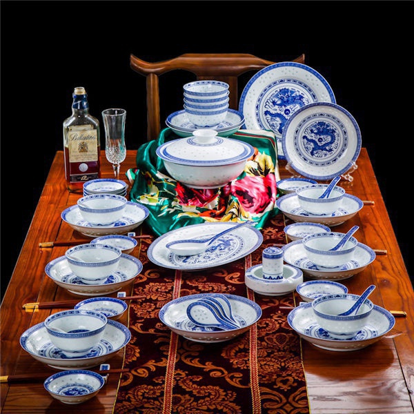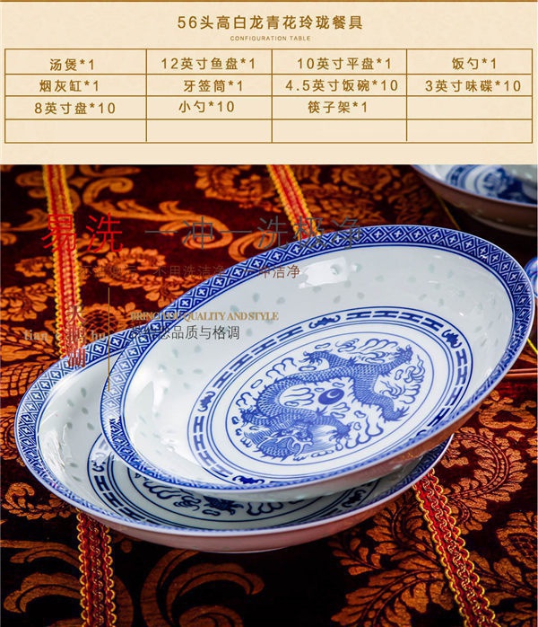 56頭高白龍的青花玲瓏餐具,一個(gè)湯煲,一個(gè)魚盤,一個(gè)十寸圓盤,一個(gè)飯勺,一個(gè)煙缸,一個(gè)牙簽筒,十個(gè)4.5寸飯碗,十個(gè)三寸碟,十個(gè)八寸盤,十個(gè)調(diào)羹,十個(gè)筷子架。56頭高白龍的青花玲瓏餐具,一個(gè)湯煲,一個(gè)魚盤,一個(gè)十寸圓盤,一個(gè)飯勺,一個(gè)煙缸,一個(gè)牙簽筒,十個(gè)4.5寸飯碗,十個(gè)三寸碟,十個(gè)八寸盤,十個(gè)調(diào)羹,十個(gè)筷子架。