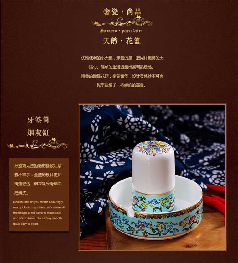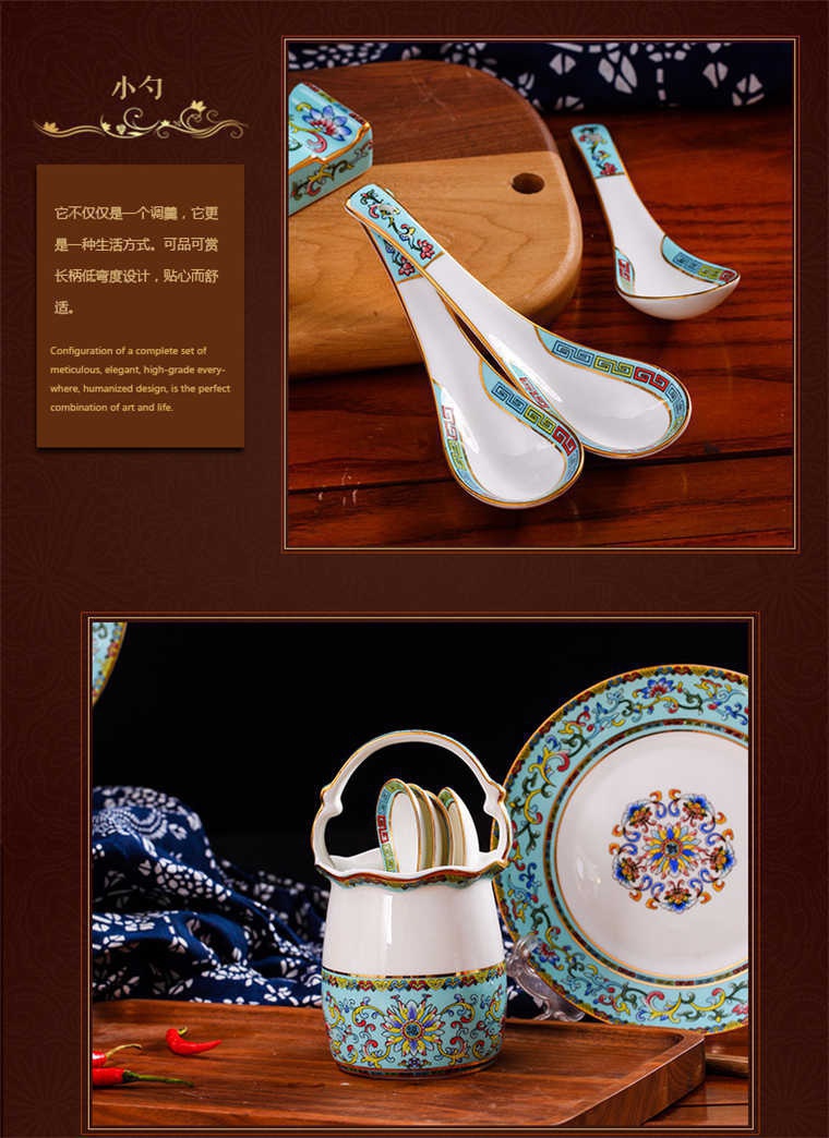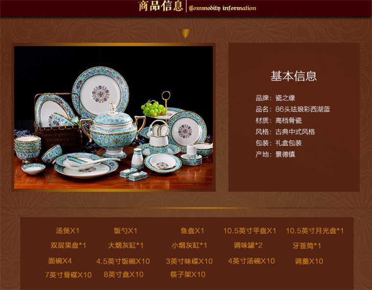 86頭琺瑯彩西湖藍(lán),一個湯煲,一個飯勺,一個魚盤,一個10.5寸平盤,一個10.5寸月光盤,雙層果盤一個,一個大煙缸,一個小煙缸,二個調(diào)料罐,一個牙簽筒,四個面碗,十個4.5寸飯碗,十個三寸調(diào)味碟,十個4寸湯碗,十個調(diào)羹,十個7寸骨碟,十個八寸盤,十個筷子架.