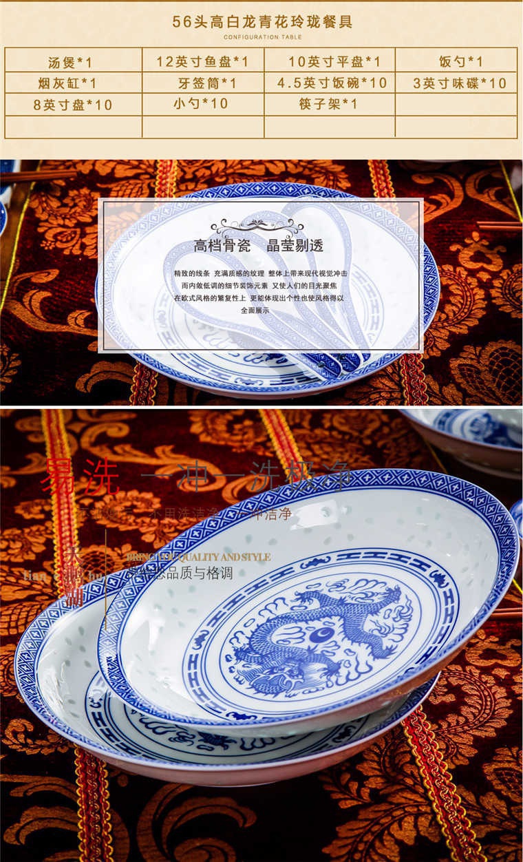 56頭高白龍的青花玲瓏餐具,一個湯煲,一個魚盤,一個十寸圓盤,一個飯勺,一個煙缸,一個牙簽筒,十個4.5寸飯碗,十個三寸碟,十個八寸盤,十個調(diào)羹,十個筷子架。56頭高白龍的青花玲瓏餐具,一個湯煲,一個魚盤,一個十寸圓盤,一個飯勺,一個煙缸,一個牙簽筒,十個4.5寸飯碗,十個三寸碟,十個八寸盤,十個調(diào)羹,十個筷子架。